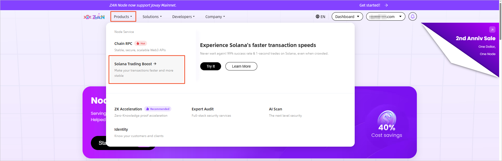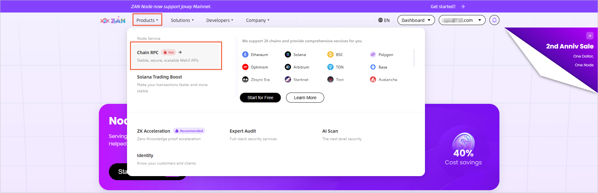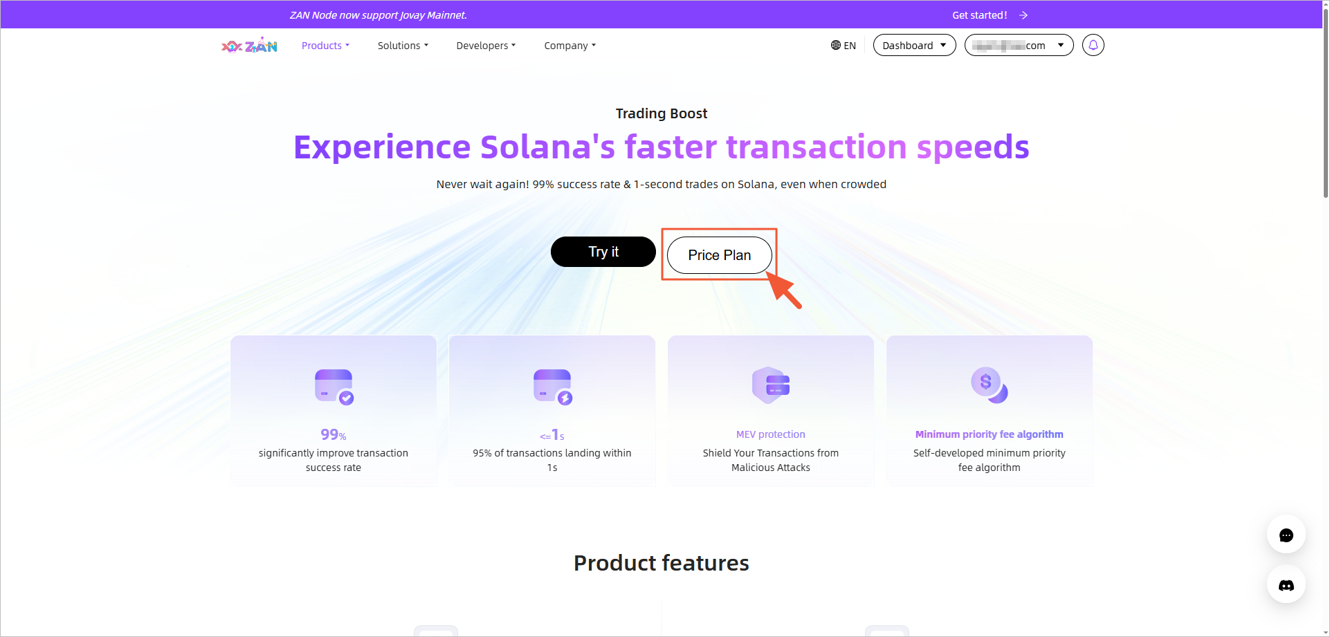 - Log in to the ZAN official website and click on Products > Node Service in the top navigation bar to go to the Node Service product introduction page.