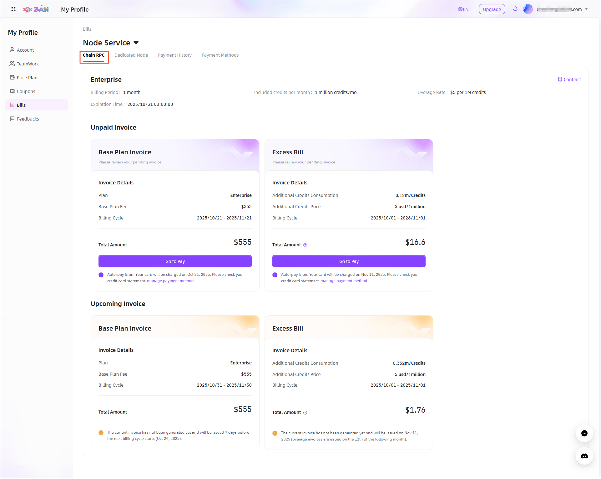 In the Bills page, the Chain RPC tab will be displayed exclusively for active Growth,Β Pro, or Enterprise plan subscribers during their service period. This tab provides: