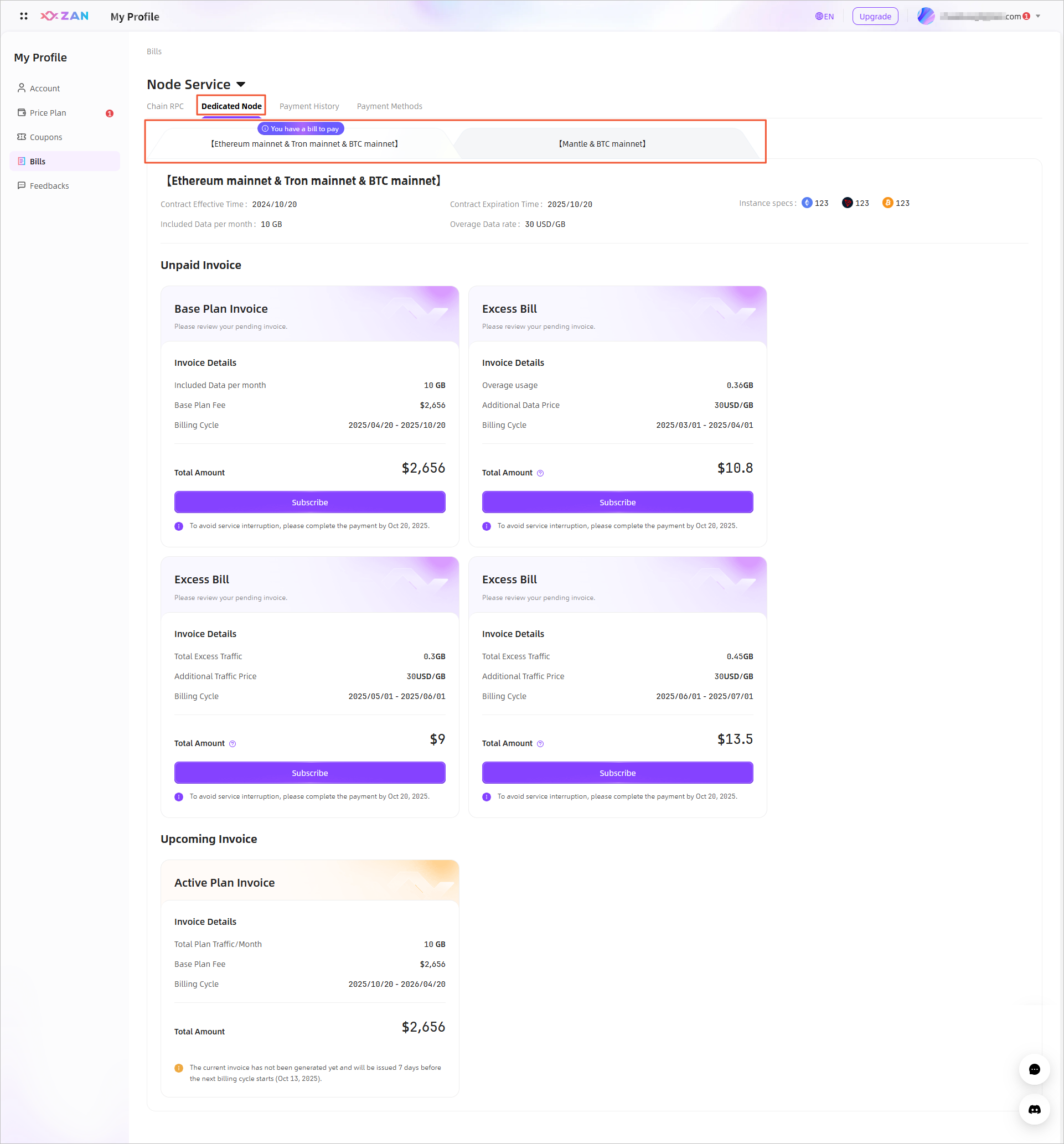 If you have purchased customized dedicated node service and are within the service period, theΒ Dedicated NodeΒ tab in the Bills page will be displayed, showing contracts information for all purchased dedicated nodes (supporting tab switching to view information for different contracts), as well as unpaid and upcoming billing information.