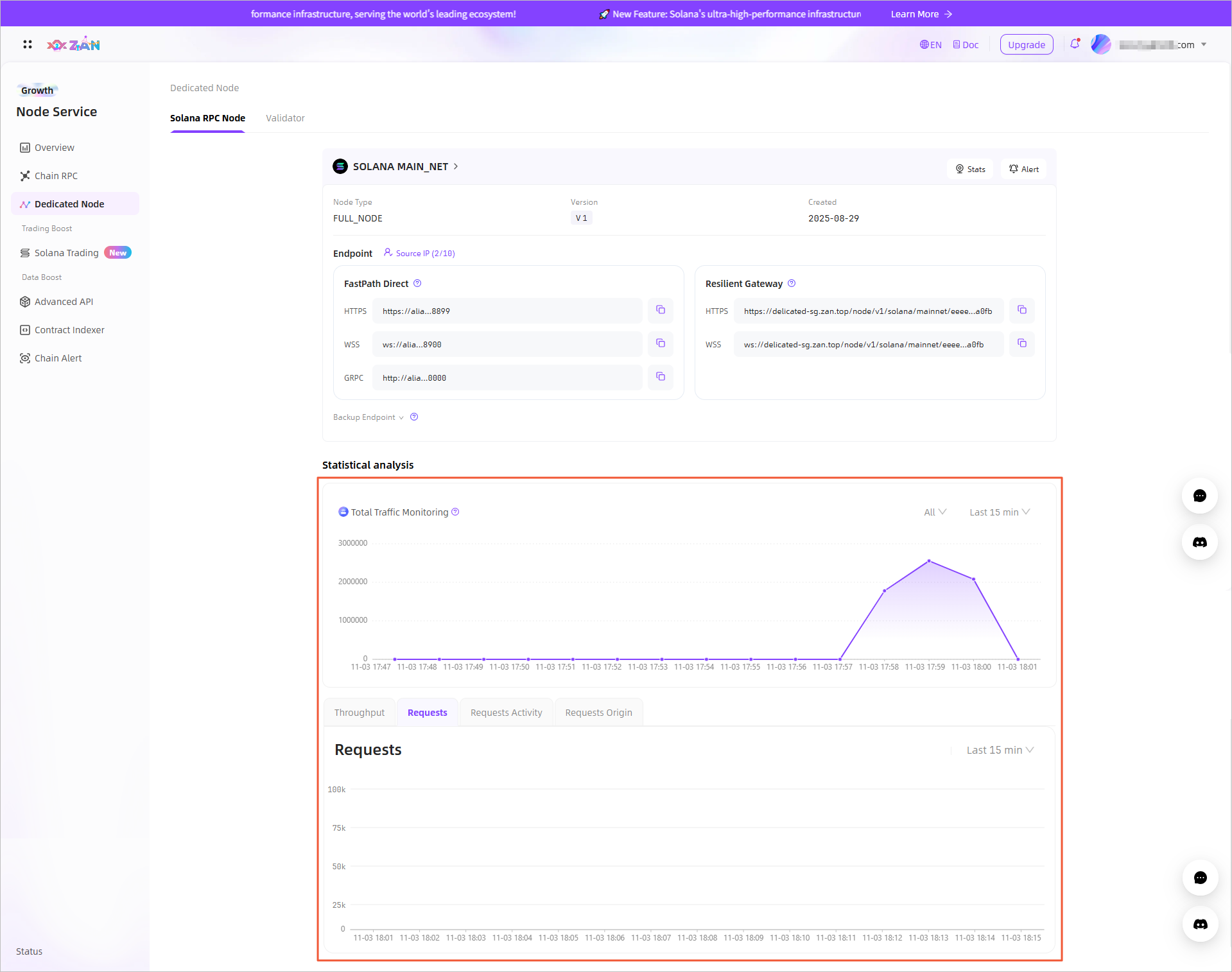 The platform supports real-time monitoring of total traffic usage across multiple customized RPC Nodes. - Individual Node Metrics Monitoring