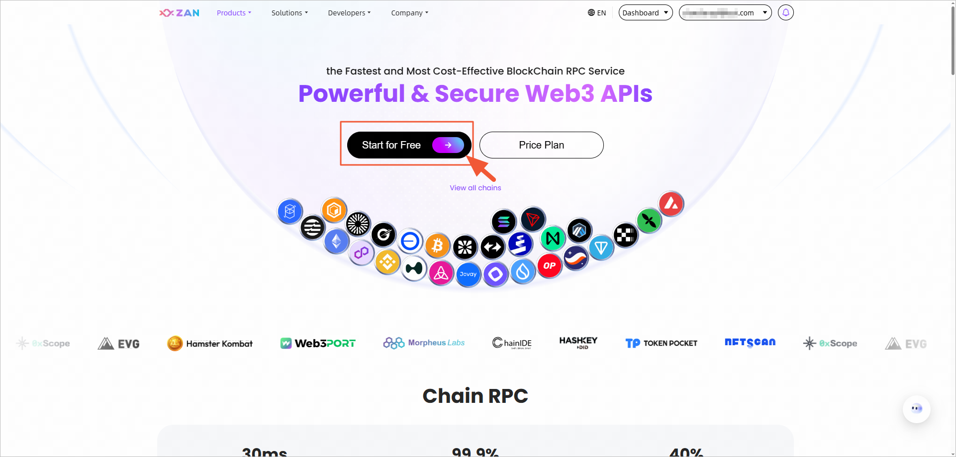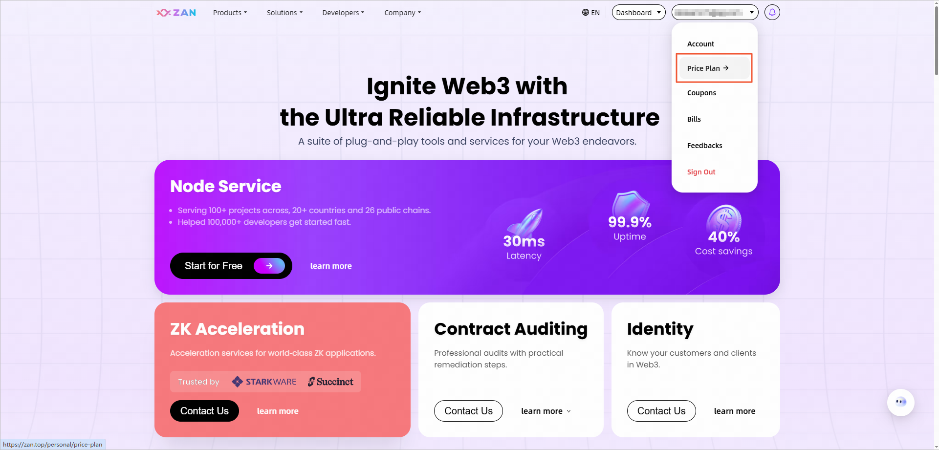 Click Log In in the upper right corner of the ZAN Node Service Console. Enter your account and password, then you can start for a free plan!