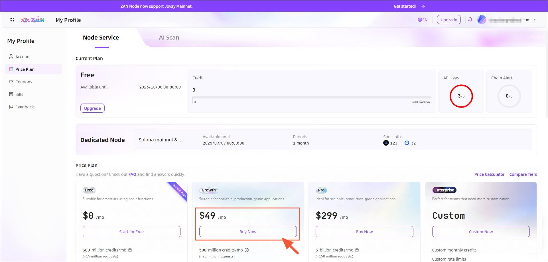 On the overview page of the node service, you can view the specific credit usage details and monitor the remaining available credits for the price plan. Unlike the free plan, the price plan supports multiple purchases of credit packs.