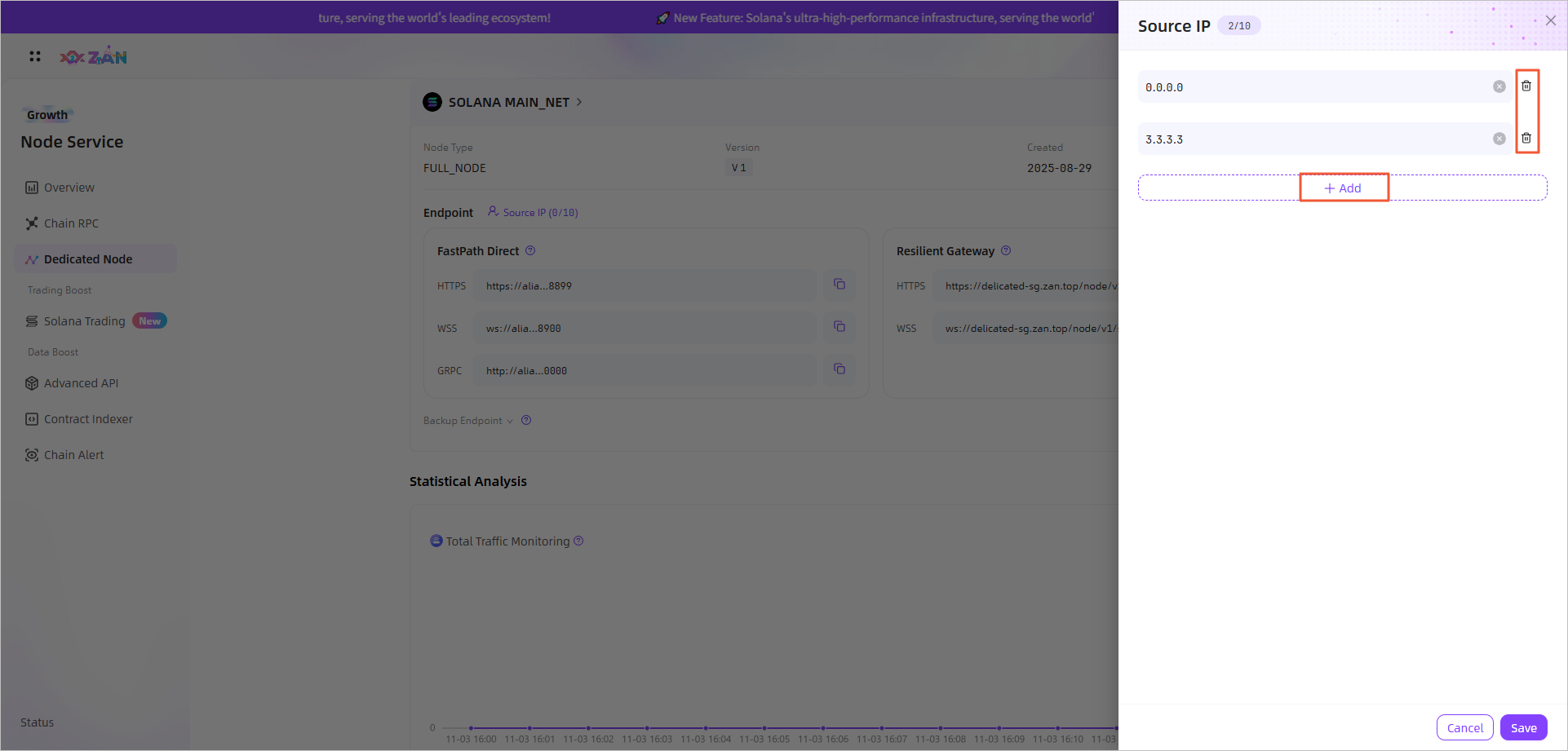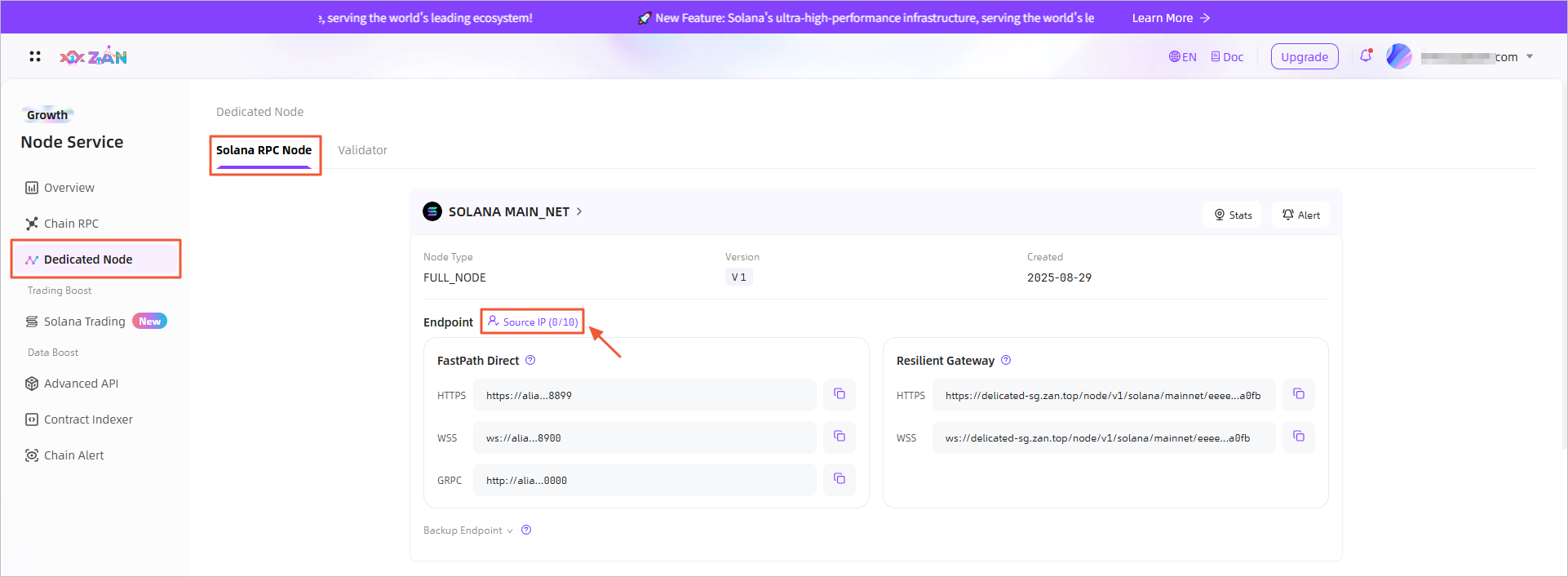 After the platform deploys the Solana RPC Node for you, you need to log in to the ZAN Node Service Console to configure the Source IP for your Solana RPC Node in order to obtain whitelist access to the Solana blockchain.