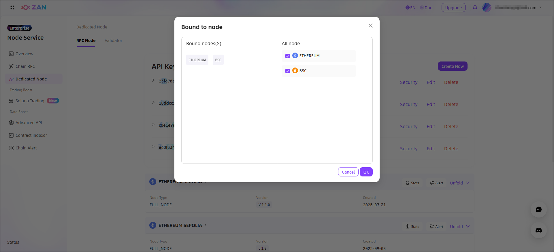 Manage the binding relationships between API Keys and RPC nodes, supporting modification of node configurations associated with existing API Keys. - Operation Path: