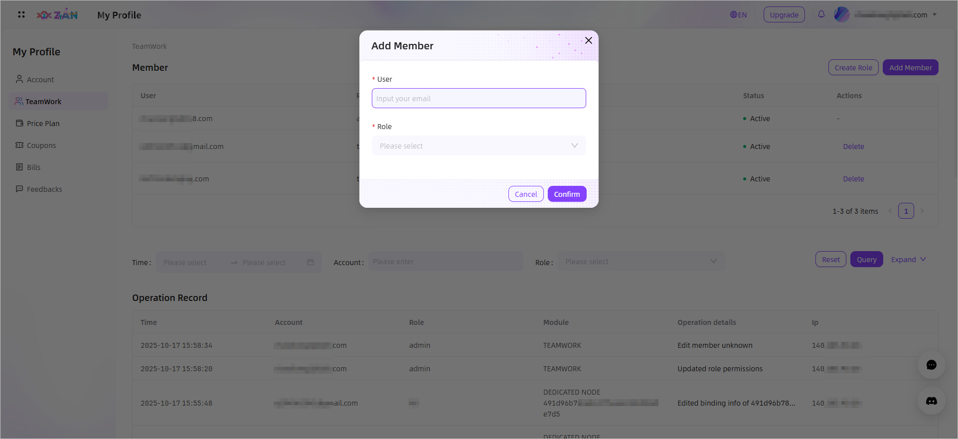 - Click OK. Then, the ZAN platform sends an email to the member.