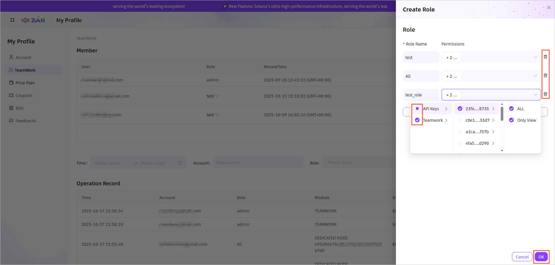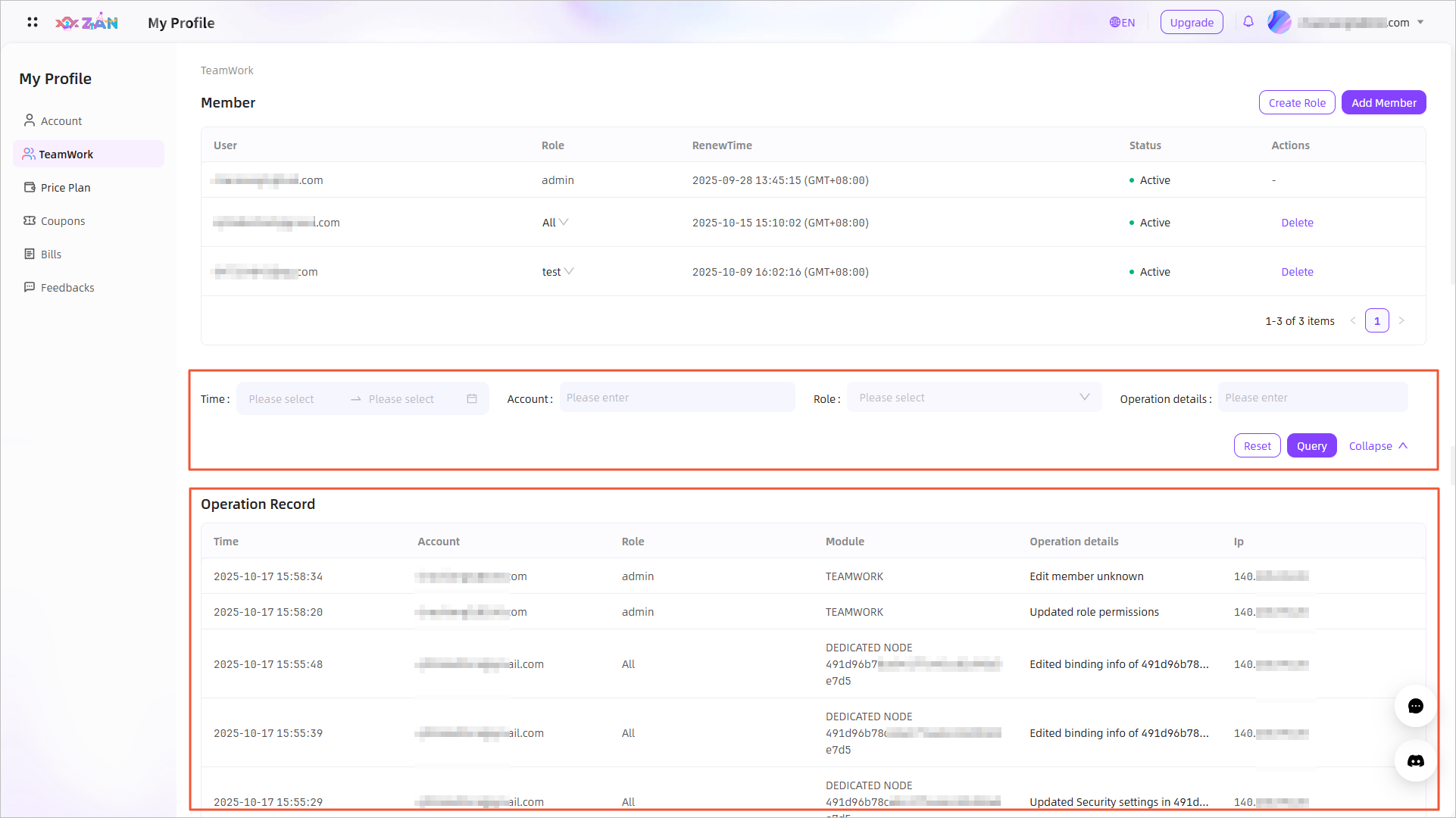 On the Teamwork page, you can view all members' operation details in the Operation Records section. Above the operation record list, combination filtering is supported through Time, Account (supports fuzzy search), Role (supports multiple selection), and Operation details (supports fuzzy search) for the records in the list.