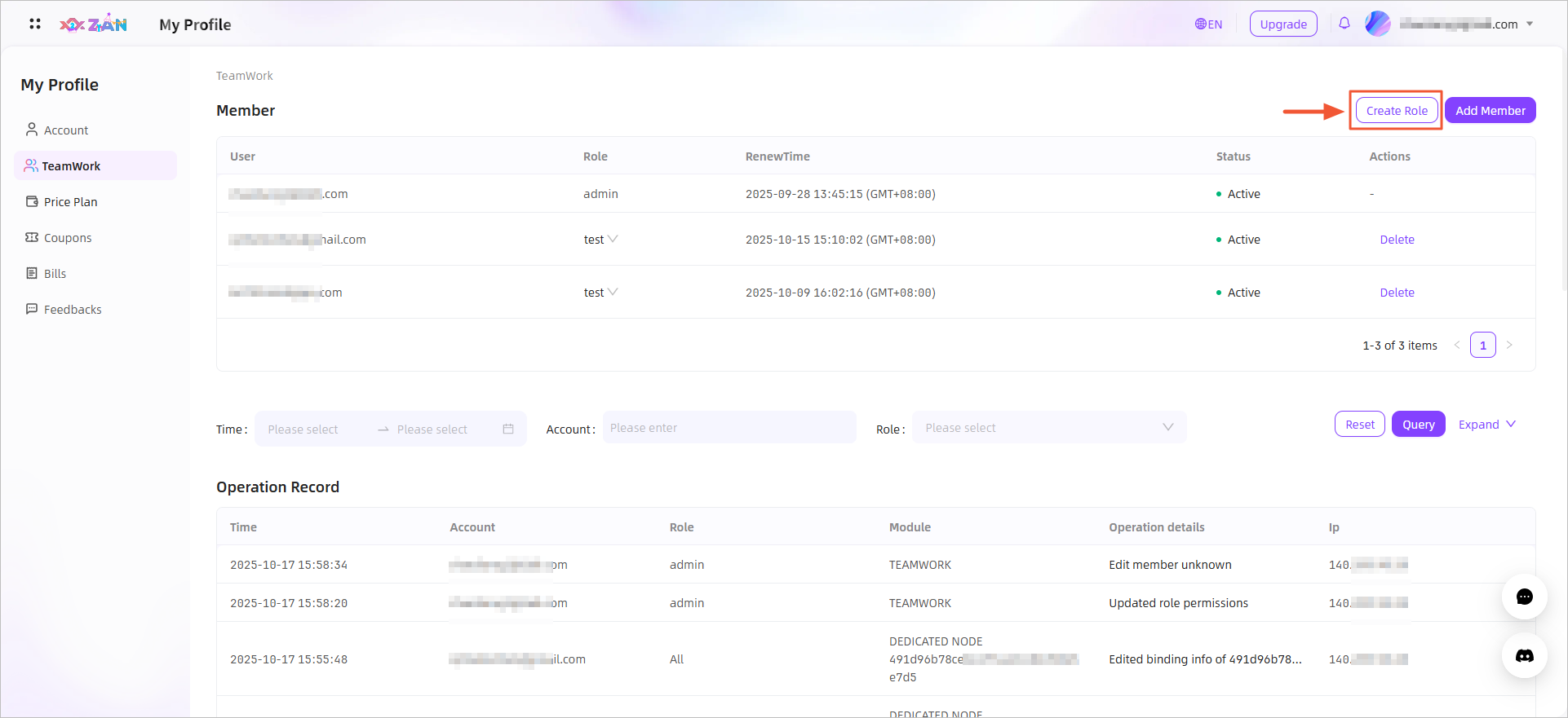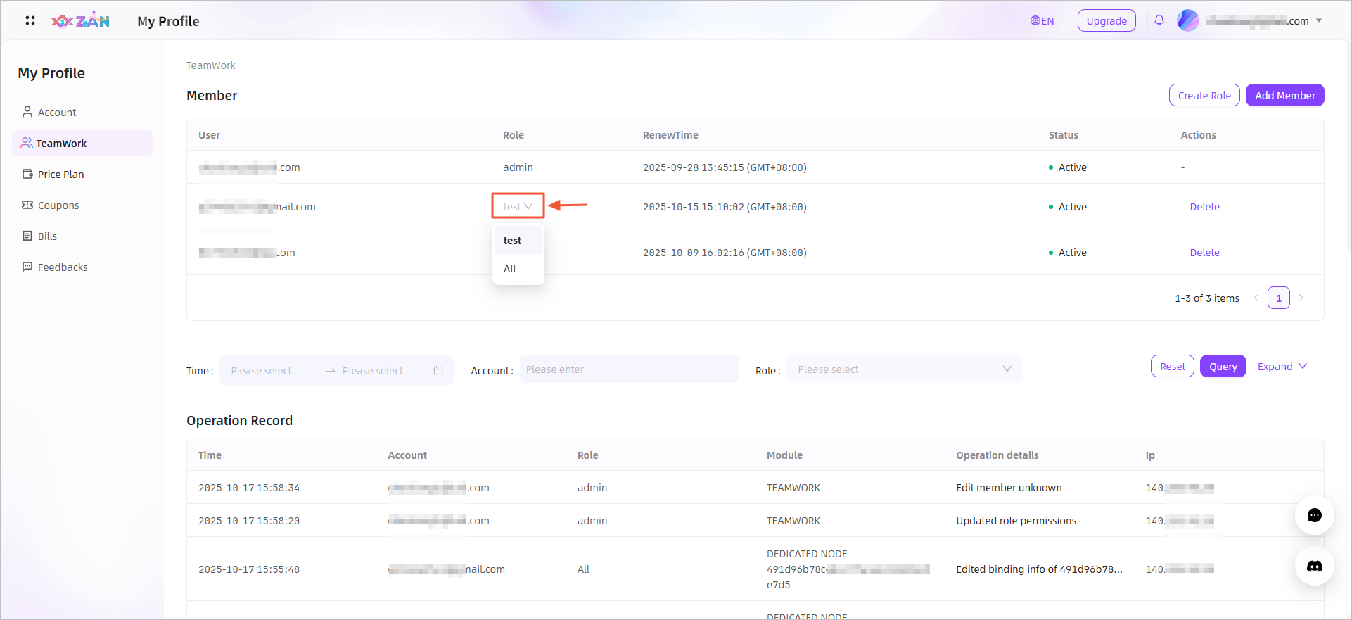 In the Member list, you can view the information about all the members of current ZAN account in a list. If you want to change the role of a member, switch the role in the Role column.