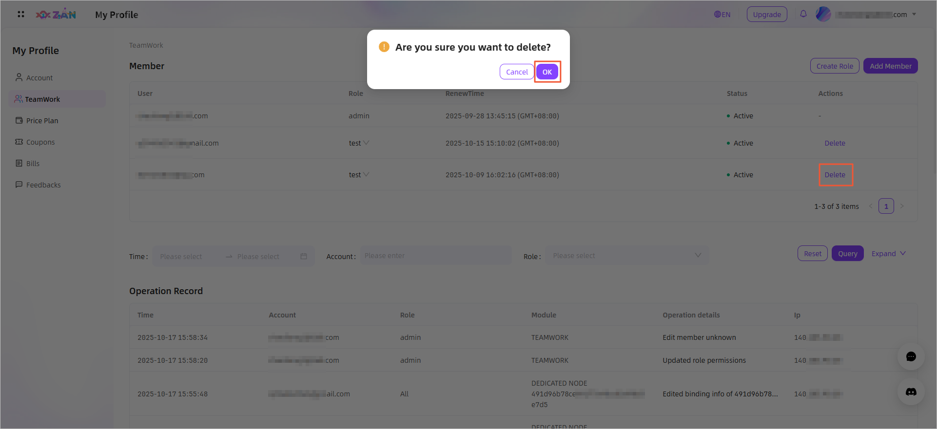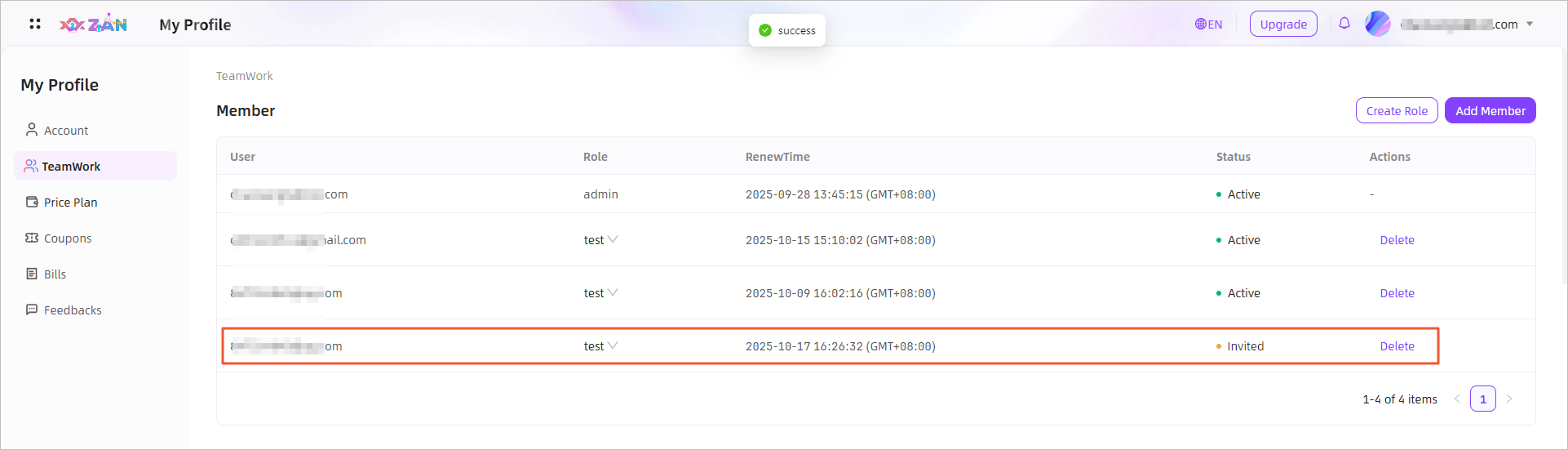In the Member list, you can view the information about all the members of the current ZAN account in a list. If you want to delete a member, click Delete in the Action column. The member is deleted after your confirmation.
