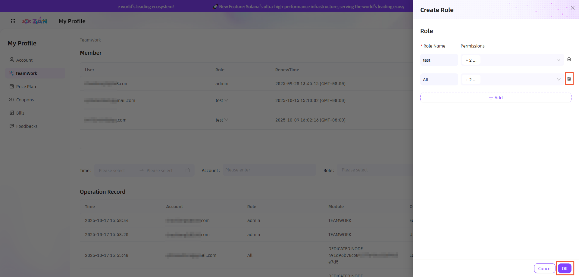In the Member list, click Create Role to open the role panel on the right. You can view all added roles and their corresponding permissions. Click the Delete icon in the Actions column on the right of the target role and click OK in the lower-right corner.